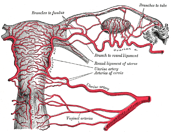 The major supply is from the uterine artery which originates from the anterior division of the internal iliac artery.1,3 The ovarian artery arises from the abdominal aorta2 and anastomoses with the uterine artery within the broad ligament.3 As the uterine artery penetrates deeper into the layers of the uterus it gives off arcuate arteries, radial arteries, and finally spiral arteries which supply the endometrium.1,4